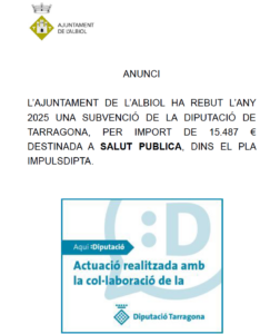 L’Ajuntament de l’Albiol informa que ha rebut aquest any 2025 una subvenció de la Diputació de Tarragona per import de 15.487 euros, destinada a l’àmbit de Salut Pública, dins el Pla ImpulsDipta.